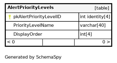 | pk_AlertPriorityLevelID | Primary key | Asc | pkAlertPriorityLevelID |