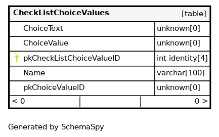 | PK__CheckLis__777ABD79242D21BE | Primary key | Asc | pkCheckListChoiceValueID |