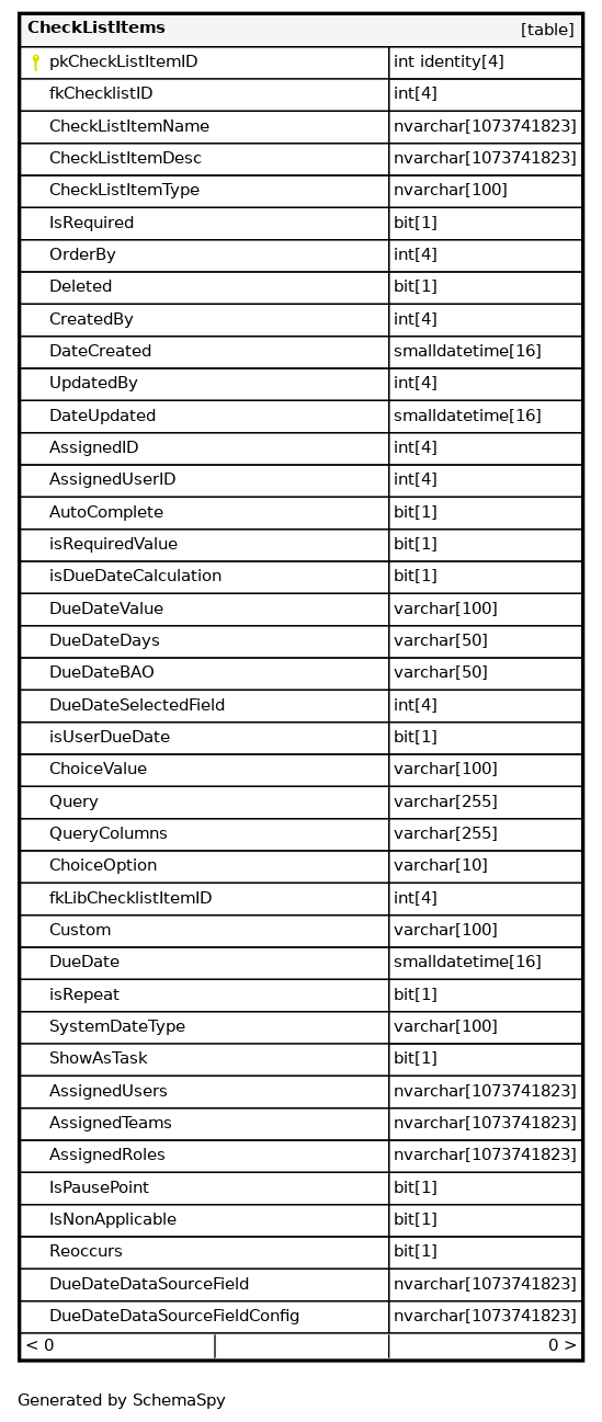 | PK_CheckListFields | Primary key | Asc | pkCheckListItemID |