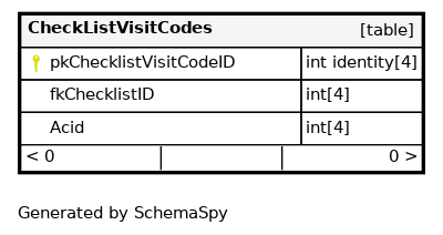 | pkChecklistVisitCodeID | int identity | 4 | √ | null |