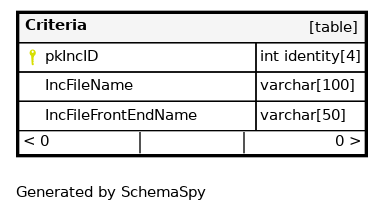 | PK__Criteria__505BE8D359DB2E46 | Primary key | Asc | pkIncID |