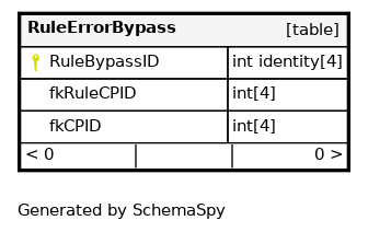 | PK__RuleErrorBypass__4A4F9D4A | Primary key | Asc | RuleBypassID |